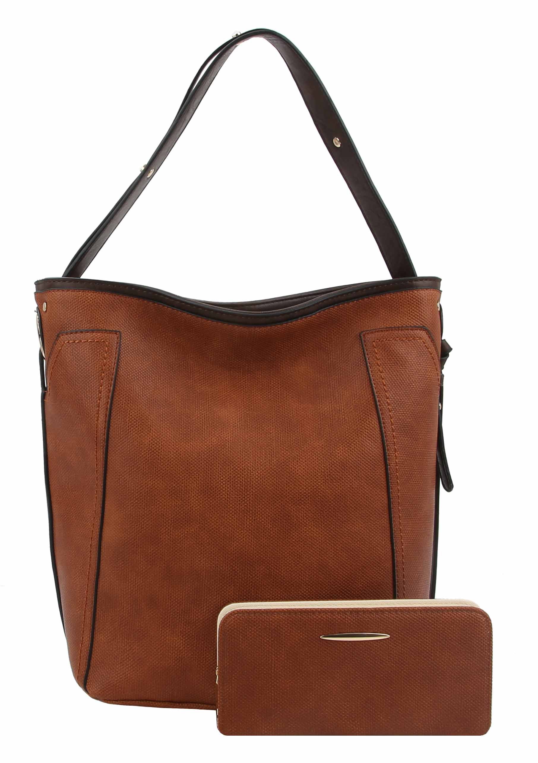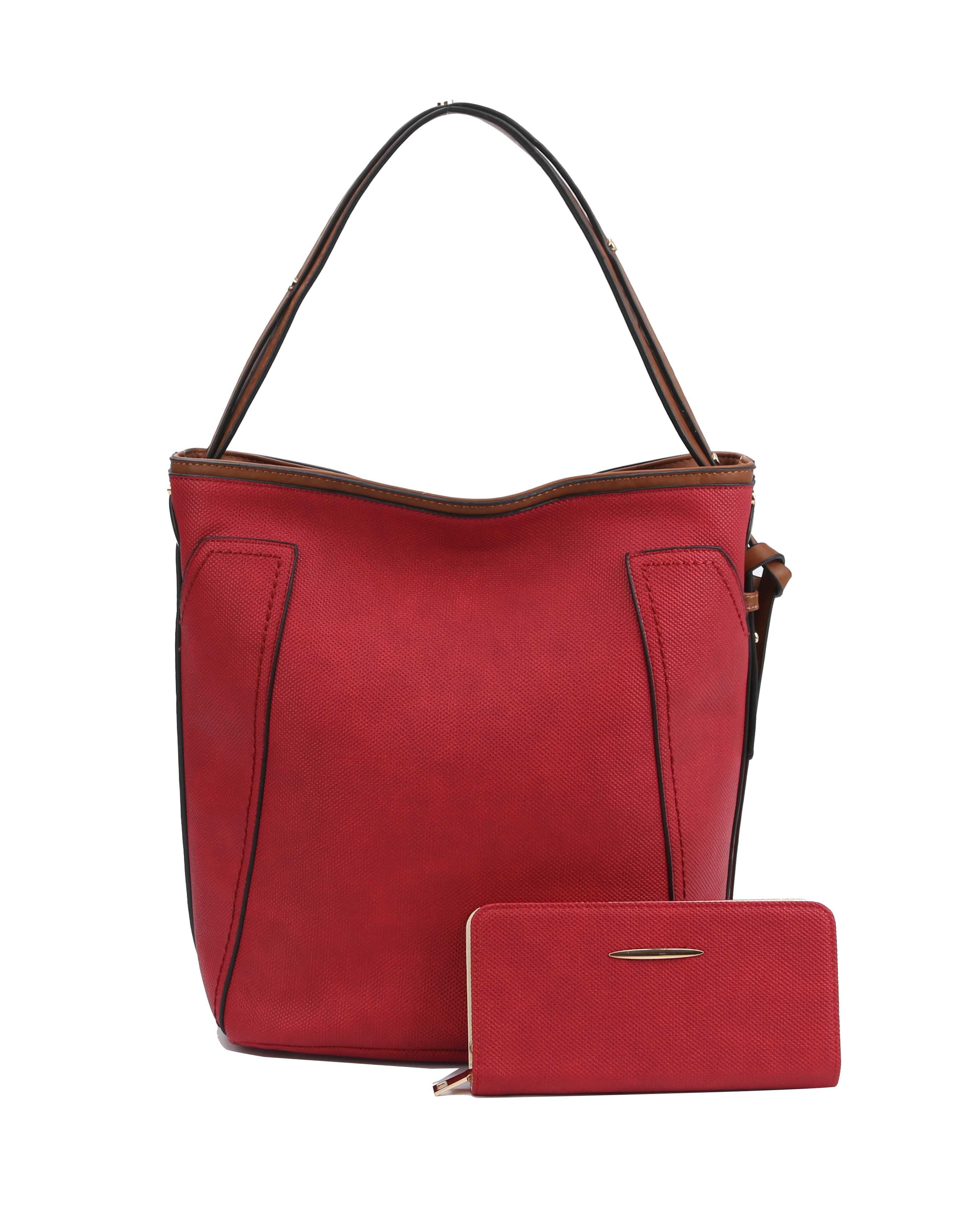 Get ready to conquer the work day with the Samantha Faux Leather Work Tote and matching Wallet! The textured leather and decorated top handle add a touch of sophistication, while the key fob and coordinating wallet offer convenience and style. Upgrade your work look with this must-have set.