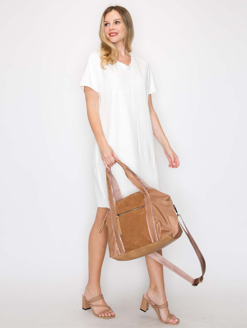 Indulge in luxurious travel with the Claire Chamois Leather Travel Duffel Bag. Combining style and functionality, this bag is perfect for weekends and gym trips. Its spacious interior and adjustable strap make it the ideal companion for your on-the-go lifestyle. Elevate your travels with this sophisticated and elegant duffel bag.